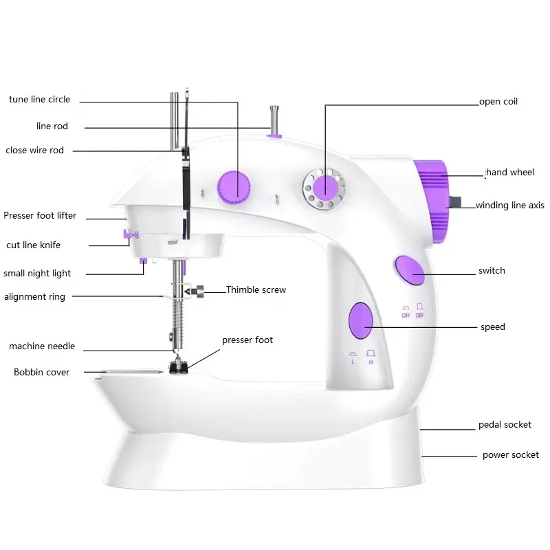 Package Contents: 1 x Mini Sewing Machine, 1 x Foot Pedal, 1 x Needle-threading Device, 1 x Threading Needle, 2 x Bobbin with Thread, 2 x Bobbin without Thread, 1 x Adapter, 1 x English User Manual